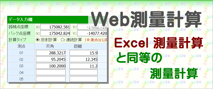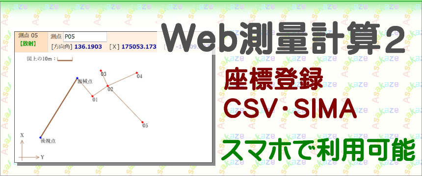 Web 測量計算2は、座標登録ができ、CSV・SIMAデータの読み込み・書き出しなど、Excel測量計算(Ver.2)と同等の機能を追加した Web 測量計算 の進化版です。